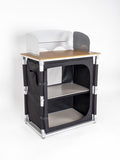 Die Campingküche BAMBOO QUICK MINI ist in Sekunden einsatzbereit durch komfortables Schnellaufbau-System. Sie hat eine Arbeitsplatte aus Bambus, ein leichtes Gestell aus Aluminium, Bezug aus sehr robustem Oxford-Polyester und Einlegeböden aus stabilen MDF-Platten.
