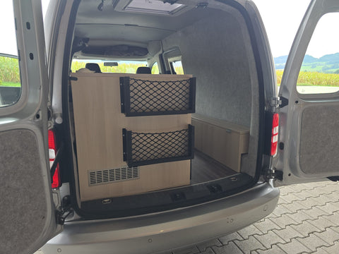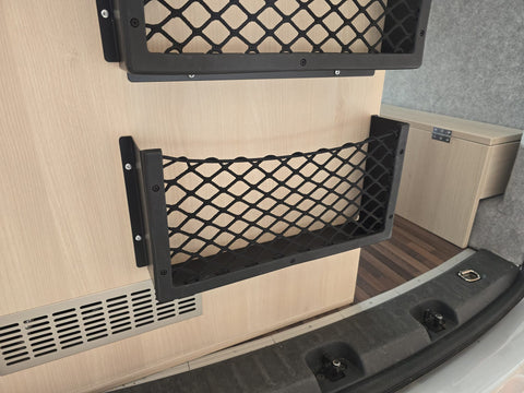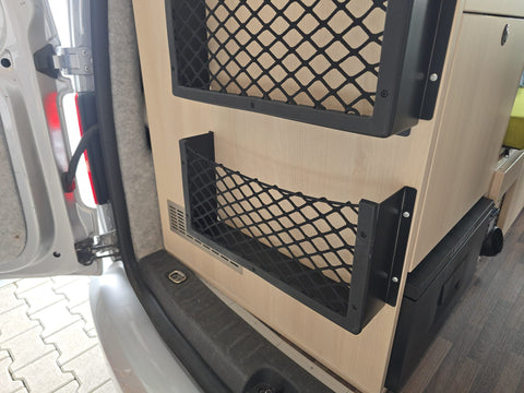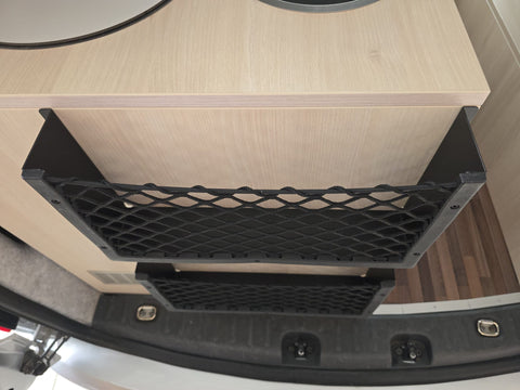 Ablagefach Komplettset mit stabilem Aluminiumrahmen und elastischem Netzgewebe, vormontiert und "plug and play" mit Montagematerial. Es schafft im Fahrzeug zusätzlichen Stauraum für Utensilien. Bohrungsdurchmesser 4,5 mm.
