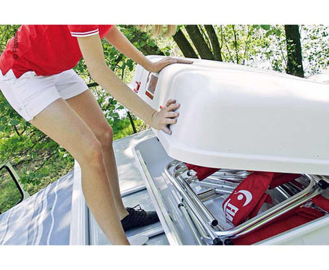 Le coffre classique pour camping-cars en plastique ABS-Plus, résistant aux chocs et aux intempéries, avec protection UV en couche épaisse et donc très résistant au vieillissement. Les tiges de montage et les charnières sont en acier inoxydable.