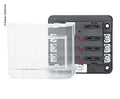 Distributore compatto di potenza positivo/negativo. Dotato di 6 uscite plus e distribuzione di terra. L'alimentazione elettrica avviene tramite un ingresso centrale ciascuno. Se un fusibile è difettoso, ciò viene segnalato da un LED. L'unità completa è dotata di una copertura protettiva. Le rispettive uscite positive possono gestire fino a 30 A. Il carico totale dell'unità è di 100 A sia sul lato positivo che su quello negativo. È possibile realizzare sistemi di distribuzione completamente individuali semplicemente collegandoli tra loro.