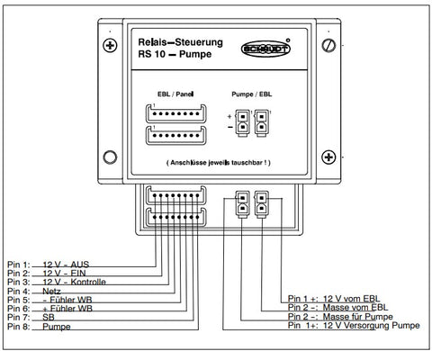 Il comando a relè RS 10 serve per accendere o spegnere l'alimentazione a 12 V della pompa dell'acqua tramite un segnale di controllo proveniente da un pannello di comando e controllo. per spegnere.