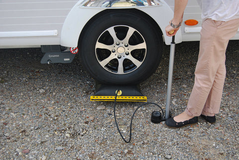Il cuscino di bilanciamento Air-Lift è un cuscino di sollevamento ad aria compressa per impieghi gravosi, resistente all'usura, alla benzina, all'olio e agli acidi. È stato sviluppato appositamente per l'impiego su camper e roulotte e ha una capacità di carico di 11 tonnellate. Con l'ausilio dell'Air-Lift è possibile compensare in modo continuo le irregolarità del pavimento e le differenze di altezza nel sottosuolo da 1,5 cm a 20 cm. Un ulteriore punto a favore è la maneggevolezza comoda e senza sforzo: per sollevare il cuscino basta posizionarlo sotto la ruota corrispondente. Utilizzando una pompa manuale/a pedale o un mini compressore da 12 V, è possibile livellare il veicolo in circa 4 minuti anche negli spazi di manovra più ristretti. L'Emuk Air-Lift viene prodotto in uno stabilimento "Made in Germany" utilizzando materiali di alta qualità e una lavorazione impeccabile. Le strisce di alluminio leggero verniciate a polvere stabilizzano il corpo di pressione in gomma rinforzato con fibre aramidiche ad alta resistenza. Uno strato di gomma particolarmente spesso (costruzione a sandwich) garantisce al cuscino d'aria compressa una protezione sufficiente contro gli agenti esterni, come pietre, detriti o vetri rotti. Il profilo scanalato garantisce una presa antiscivolo per le ruote sollevate.