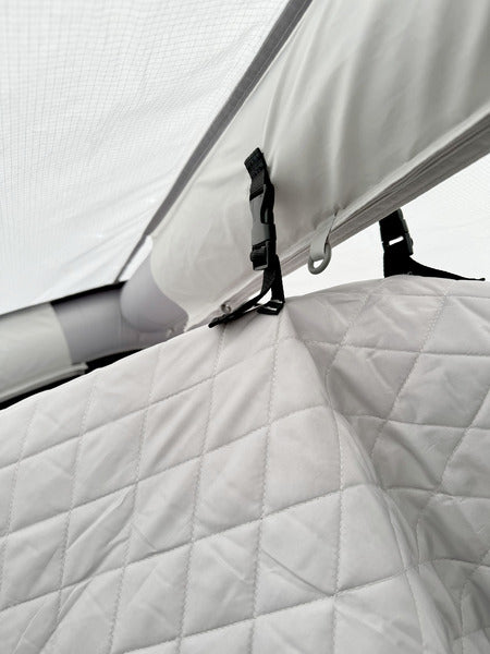 Il Thermocover è facile da installare all'interno della tenda da tetto mediante clip. Rapidamente rimovibile. Consegnato in un sacco portaoggetti.