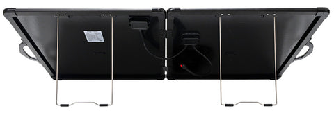 Superficie ETFE: molto robusta con elevata trasmissione della luce. Telaio sottile in alluminio con angoli di protezione. Design completamente nero. Piedini pieghevoli per l'installazione. Include 2 cavi per il collegamento ai sistemi energetici mobili*: