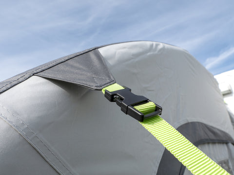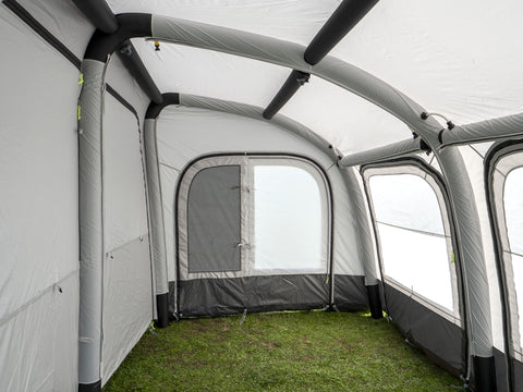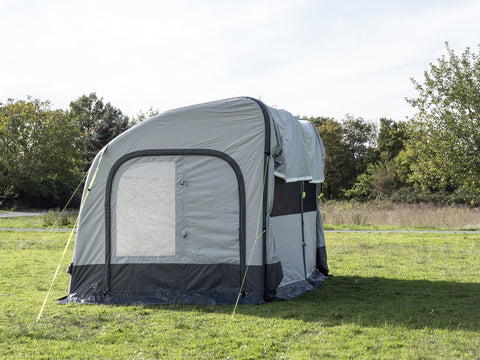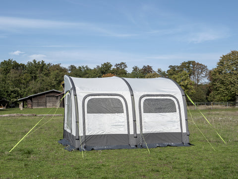 Rimani mobile! La veranda ad aria indipendente per camper TOUR PONZA AIR 390 vi consente di partire con il vostro mezzo lasciando la veranda montata. I 3 tubi dell'aria principali verticali e i 2 tubi anteriori orizzontali di rinforzo del tetto sono collegati tra loro come un sistema di GONFIAGGIO SINGOLO. È possibile gonfiare separatamente altri 4 tubi d'aria orizzontali. Grazie al materiale di alta qualità in poliestere Oxford Ribstop 300D, questa tenda è adatta anche come tenda da campeggio per tutto l'anno. I pannelli frontali e laterali sono dotati di finestre trasparenti con copertura esterna e zanzariere e possono essere arrotolati o completamente rimossi. La serratura è lunga 80 cm e può essere chiusa con una porta a forma di D (con zanzariera). Come optional sono disponibili una tenda interna e un pavimento della tenda staccabile.