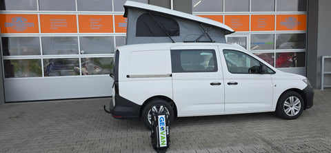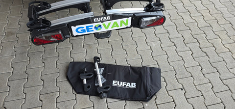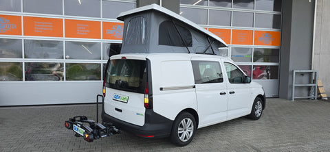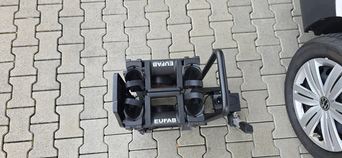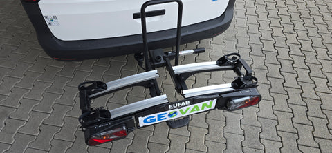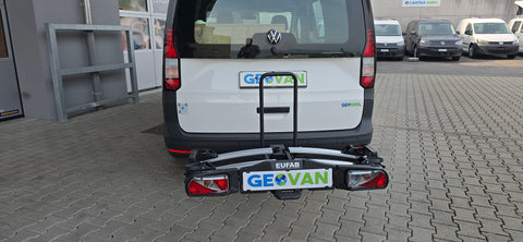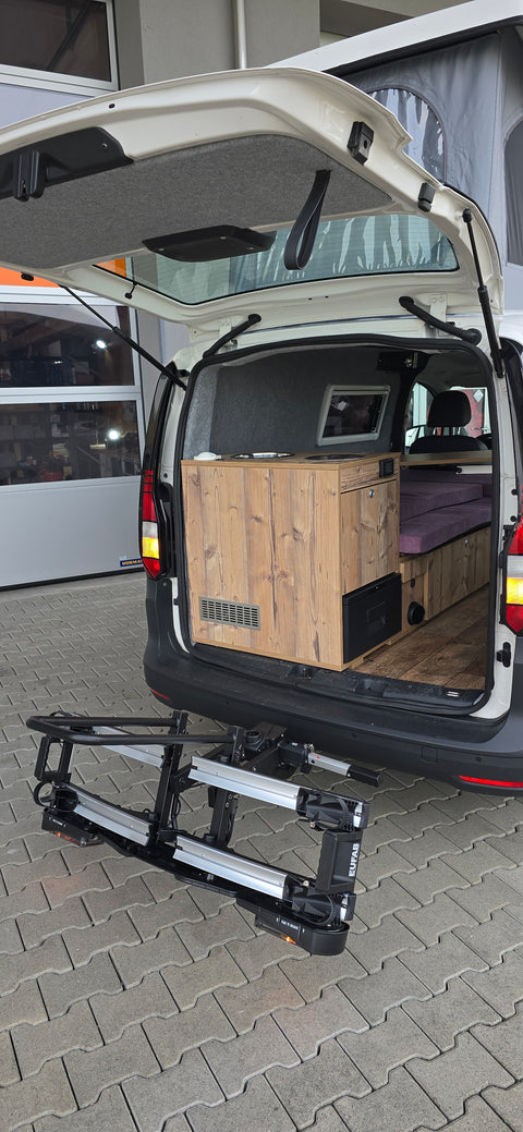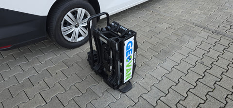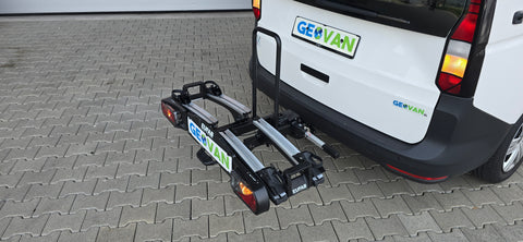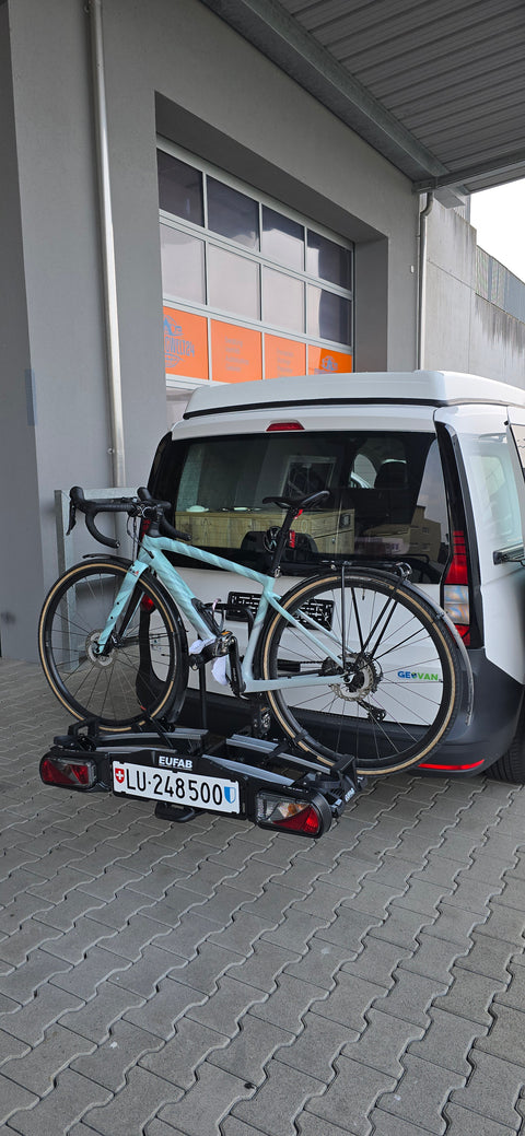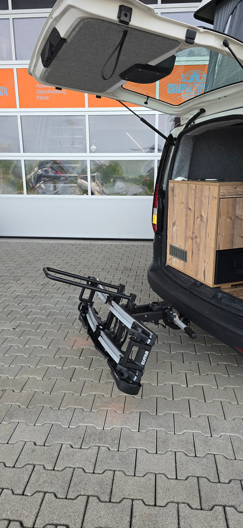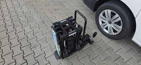 Portabiciclette per gancio traino su camper. Adatto per veicoli con bagagliaio estremamente grande, ad esempio per VW T5 e furgoni, poiché il trasportatore si trova a una distanza maggiore dal veicolo.