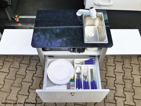 - Impianto idrico con pompa sommersa (collegamento alla presa da 12 V) e un contenitore per acqua dolce da 10 litri e uno per acqua di scarico