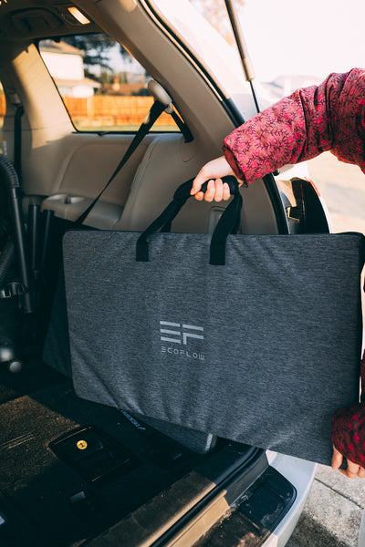 Tragbar und faltbar : Das EcoFlow 160 W Solarmodul wiegt nur 7 kg und lässt sich kompakt zusammenfalten. Gut geschützt in der stylischen Tragetasche ist es der ideale Begleiter zur kostenlosen Ladung der Ecoflow Power Stationen.