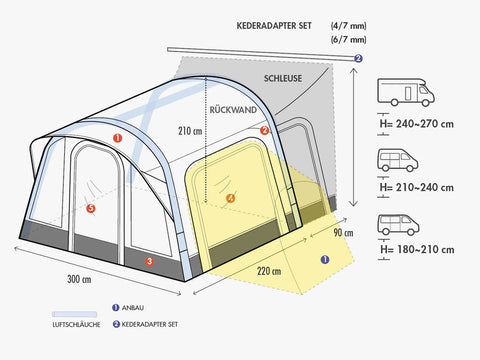 Die Schleuse verbindet das freistehende Luftvorzelt ORION mit dem Fahrzeug. Die Schleuse wird am Zelt mittels Reißverschluss und am Fahrzeug über einen Keder angebunden. Alternativ kann eine Schleusenstange genutzt werden oder die Schleuse mithilfe von Abspannleinen über das Fahrzeug abgespannt werden. Für maximale Flexibilität befinden sich in der Schleuse zwei Eingangstüren, die den direkten Zugang zum Fahrzeug gewähren.